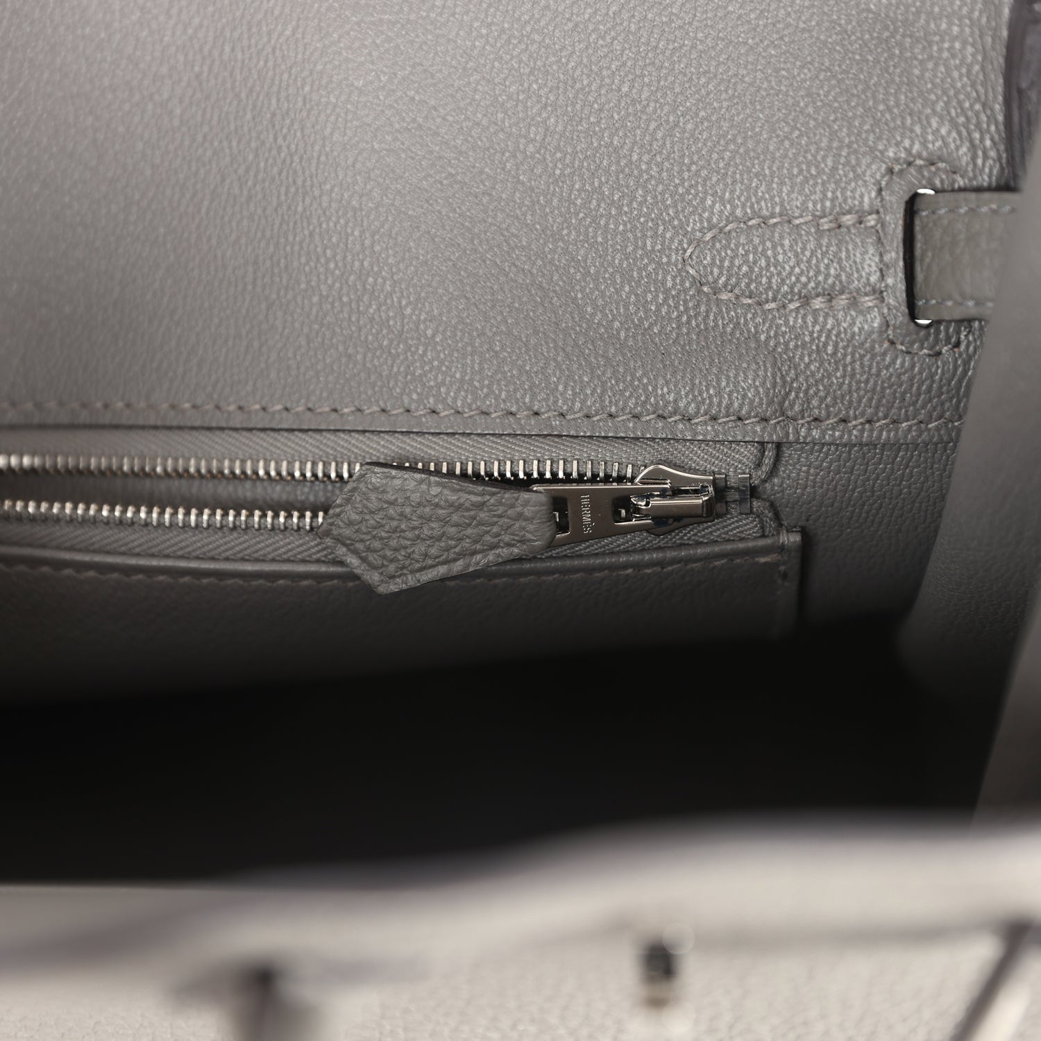 The interior is lined with Gris Meyer chevre leather and has one zip pocket with an Hermes engraved zipper pull and an open pocket on the opposite side.