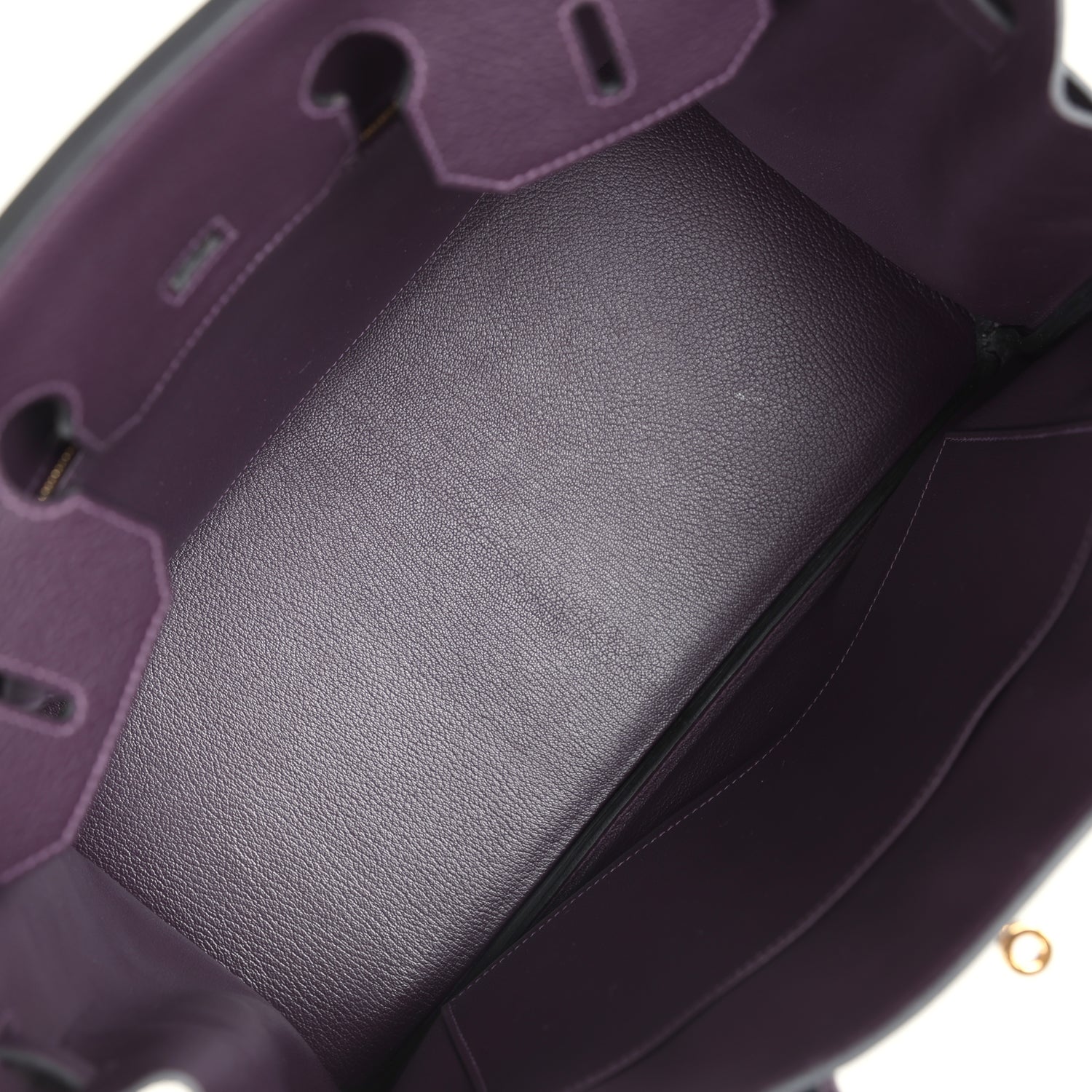 This Birkin is in Raisin clemence leather with gold hardware and has tonal stitching, front flap, two straps with center toggle closure, clochette with lock and two keys, and double rolled handles.