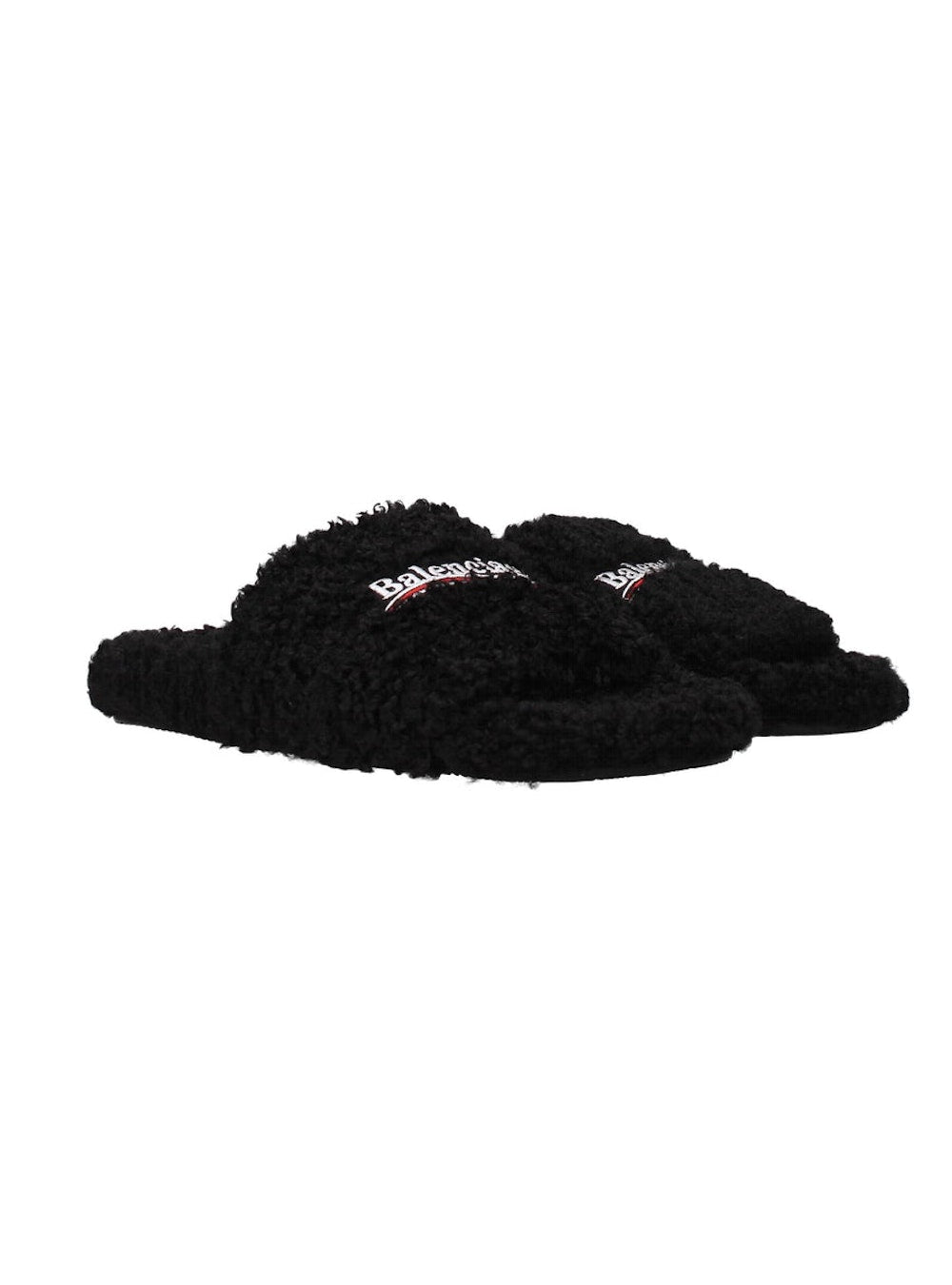 Balenciaga Slide nero. Modello caratterizzato da punta aperta e logo ricamato. Ricoperto da eco pelliccia.